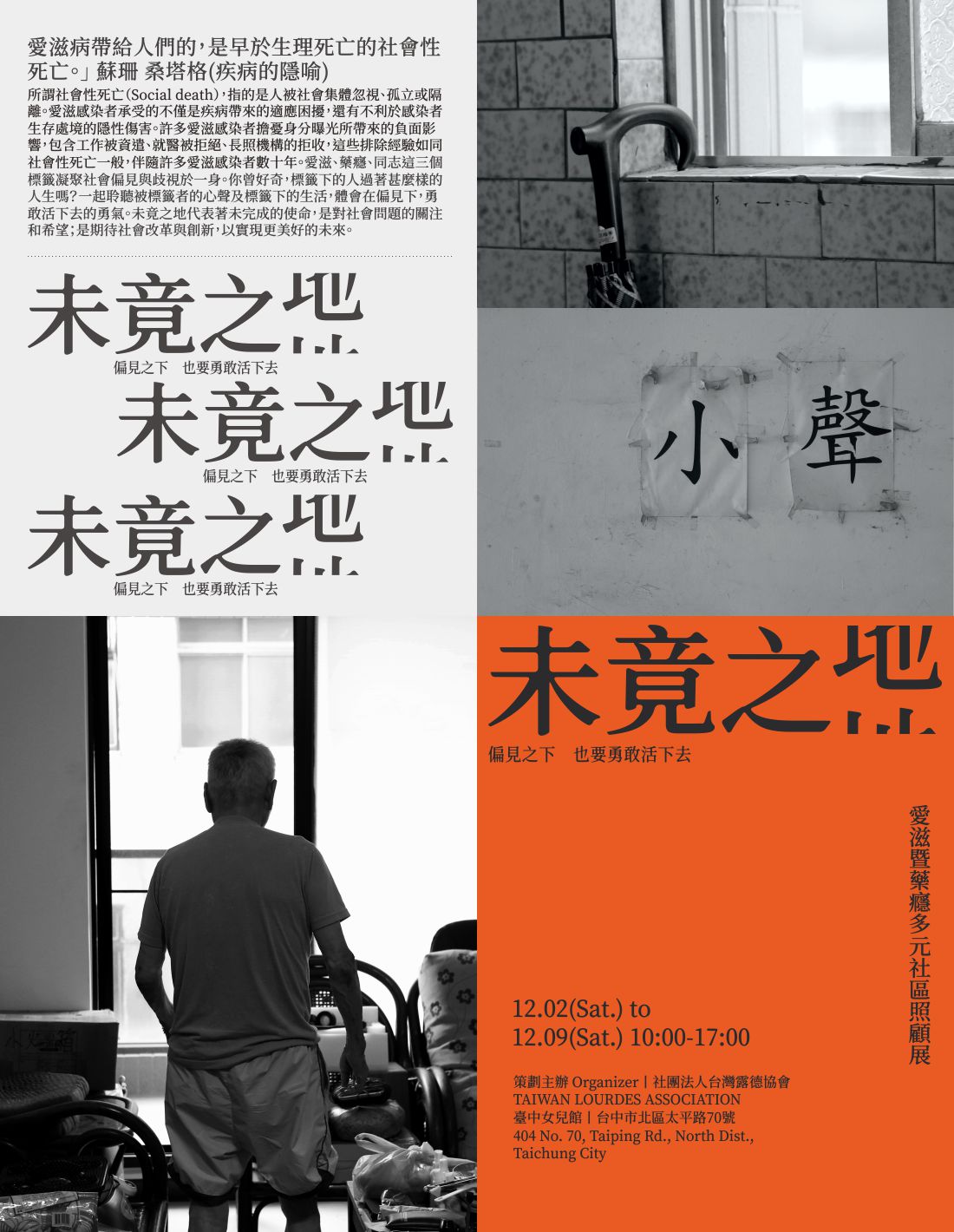 愛滋、藥癮、同志這三個標籤凝聚了社會偏見與歧視於一身;你曾好奇,標籤下的人過著甚麼樣的人生呢?聆聽被標籤者的心聲及標籤下的生活;體會在偏見之下,勇敢活下去的勇氣。未竟之地代表著未完成的使命,是對社會問題的關注和希望;是期待社會改革與創新,以實現更美好的未來。